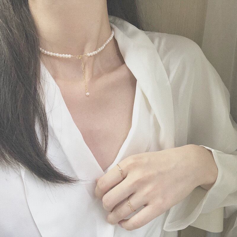 いつものカジュアル服に+αでパールを身に着けることでちょっとした華やかさとフェミニンさを+してくれます。こちらのアイテムはハートのアジャスターチェーンにパールがついており、アジャスター側を前に持って来るとかわいらしい印象に変わります。